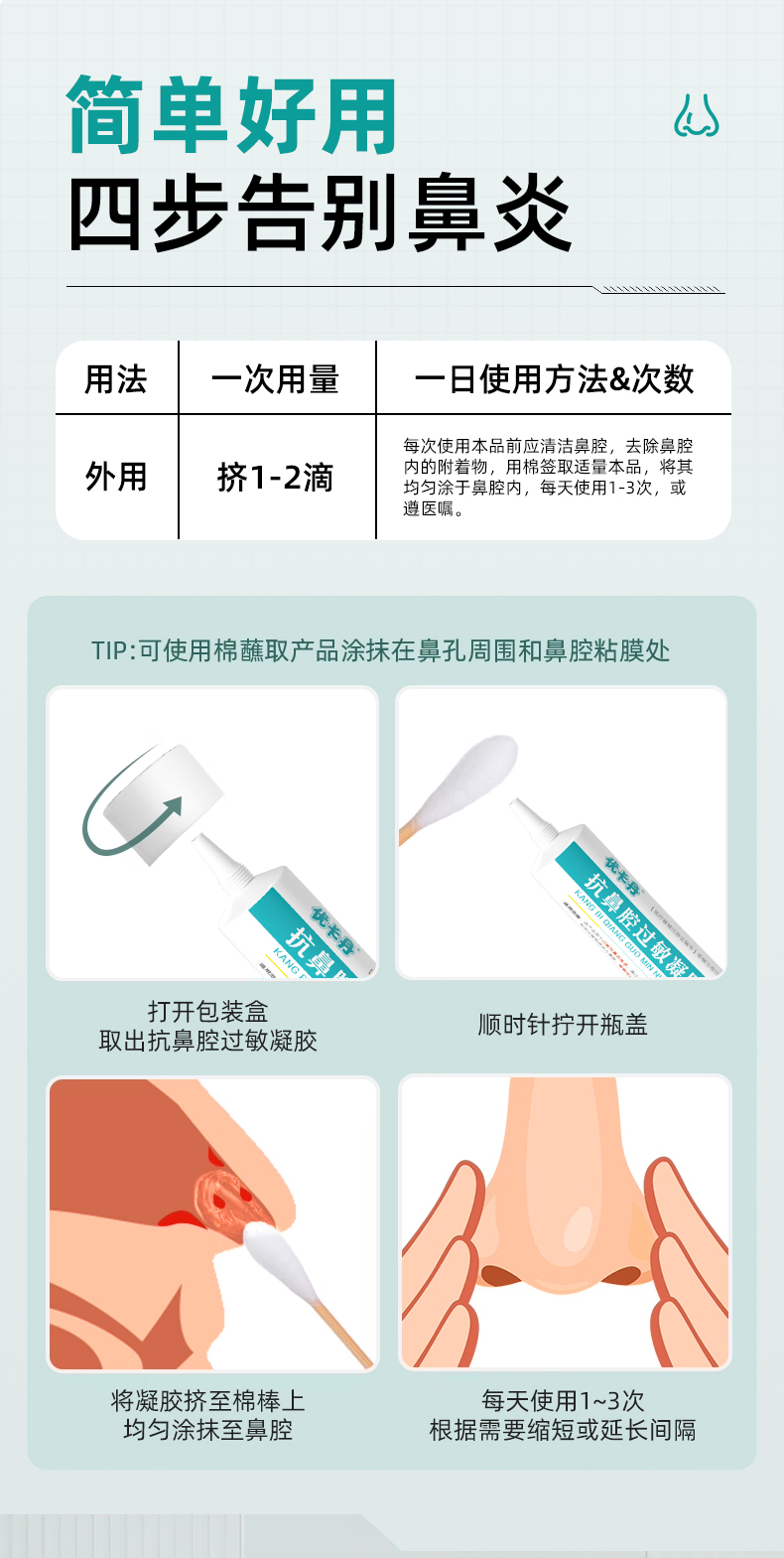 【使用方法】 每次使用本品前應清潔鼻腔,去除鼻腔內的附著物,用棉簽取適量本品,將其均勻涂于鼻腔內,每天使用1-3次,或遵醫囑。