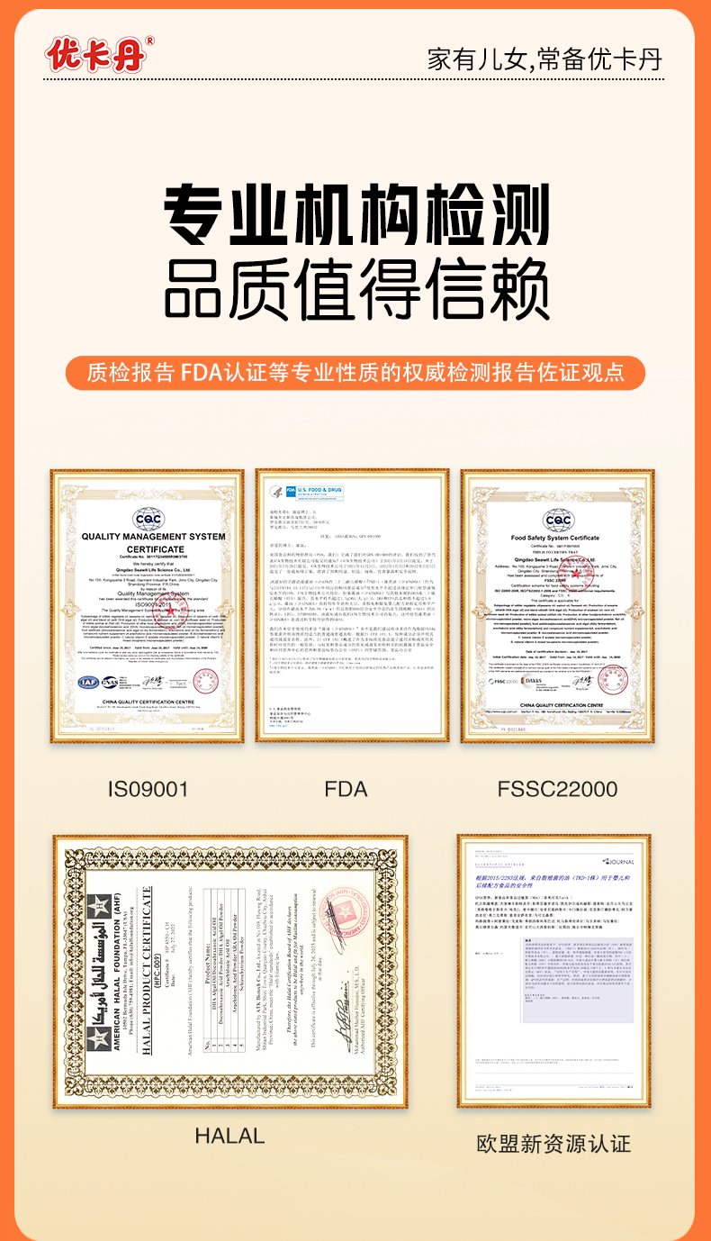 給孩子選營(yíng)養(yǎng)品,靠譜二字最讓家長(zhǎng)安心。優(yōu)卡丹DHA 藻油+ ARA凝膠糖果不僅通過了 ISO9001、FDA、FSSC22000 等國際權(quán)威檢測(cè)認(rèn)證,還手握3項(xiàng)中國專利,從配方研發(fā)到生產(chǎn)技術(shù)都經(jīng)過專業(yè)驗(yàn)證。