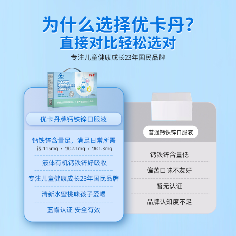 優卡丹鈣鐵鋅口服液,榮獲國家認證的 “藍帽子”保健食品標識。這代表著產品的功效、安全性及品質都經過了國家的嚴格審查,“看得見的權威保障”,孩子可以放心喝。
