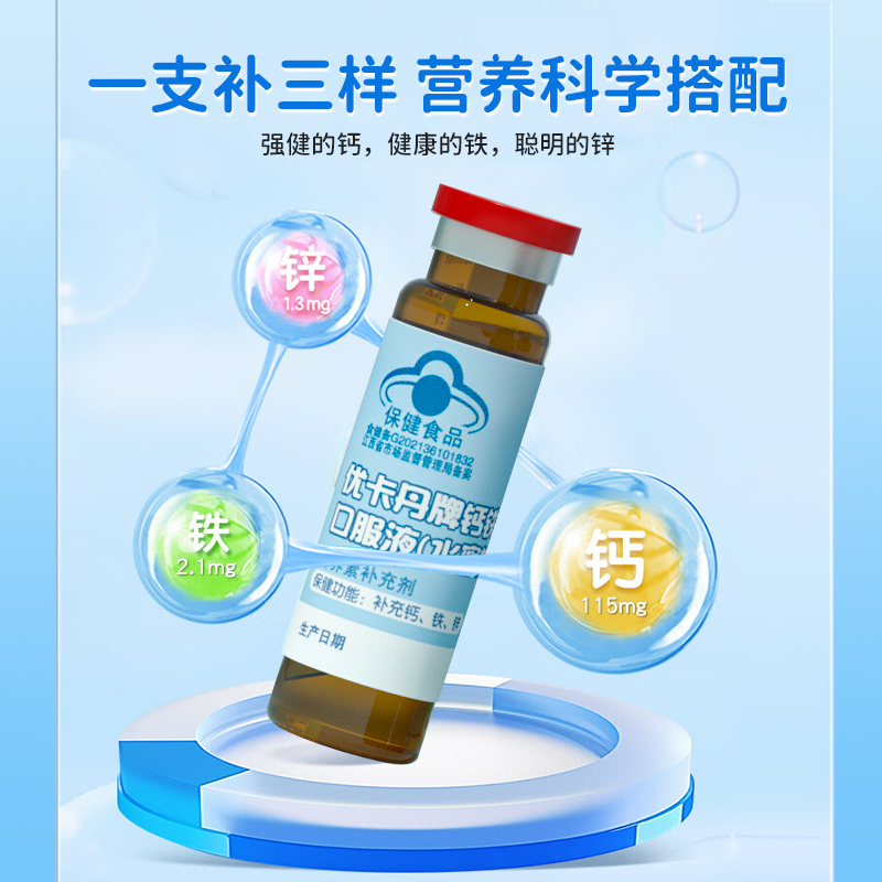 優卡丹鈣鐵鋅口服液,采用科學配比技術,實現鈣、鐵、鋅三效同補。黃金配方既能協同促進吸收,同時還能告別單一補充、輪流服用的繁瑣與浪費。